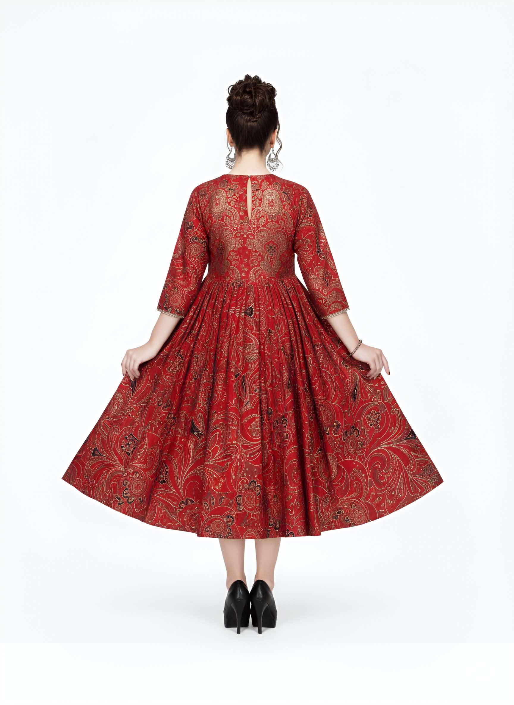 This is a **flared (girder) Anarkali/Gown Kurti** type of dress. **Rayon/Chanderi fabric** and **traditional print** make it a great and attractive option for parties, festivals or social gatherings.